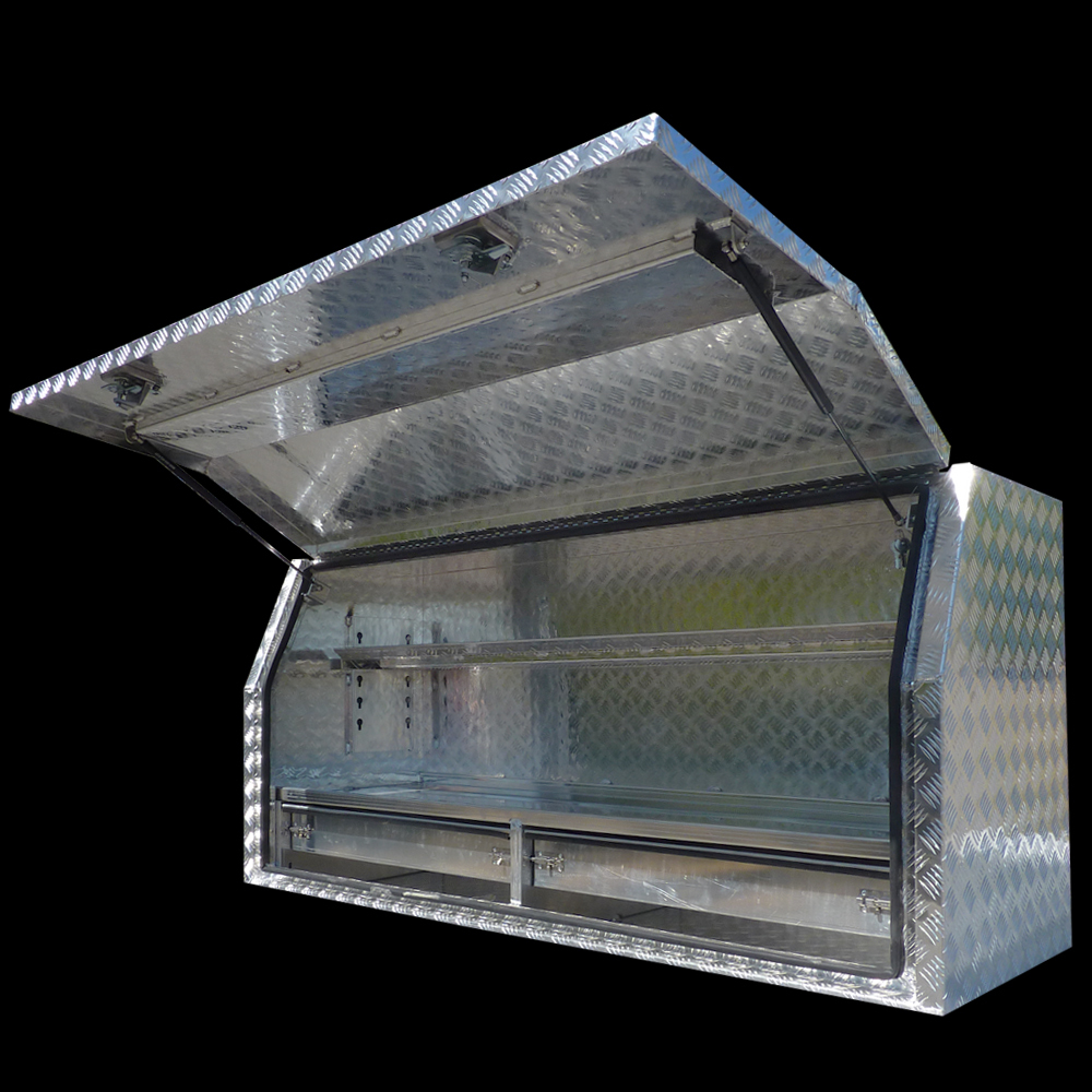 The large open space of the Aluminium Toolbox is the perfect place to store your larger tools while the two fully built-in drawers are ideal to store your smaller tools, while the adjustable height shelf is a great place to store your fittings and fixings. The two drawer Pro Box is the ultimate in Ute Tray storage. Check out our range of Accessories!