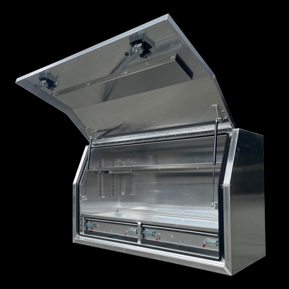 The large open space of the Aluminium Toolbox is the perfect place to store your larger tools while the two fully built-in drawers are ideal to store your smaller tools, while the adjustable height shelf is a great place to store your fittings and fixings. The two drawer Pro Box is the ultimate in Ute Tray storage. Check out our range of Accessories!