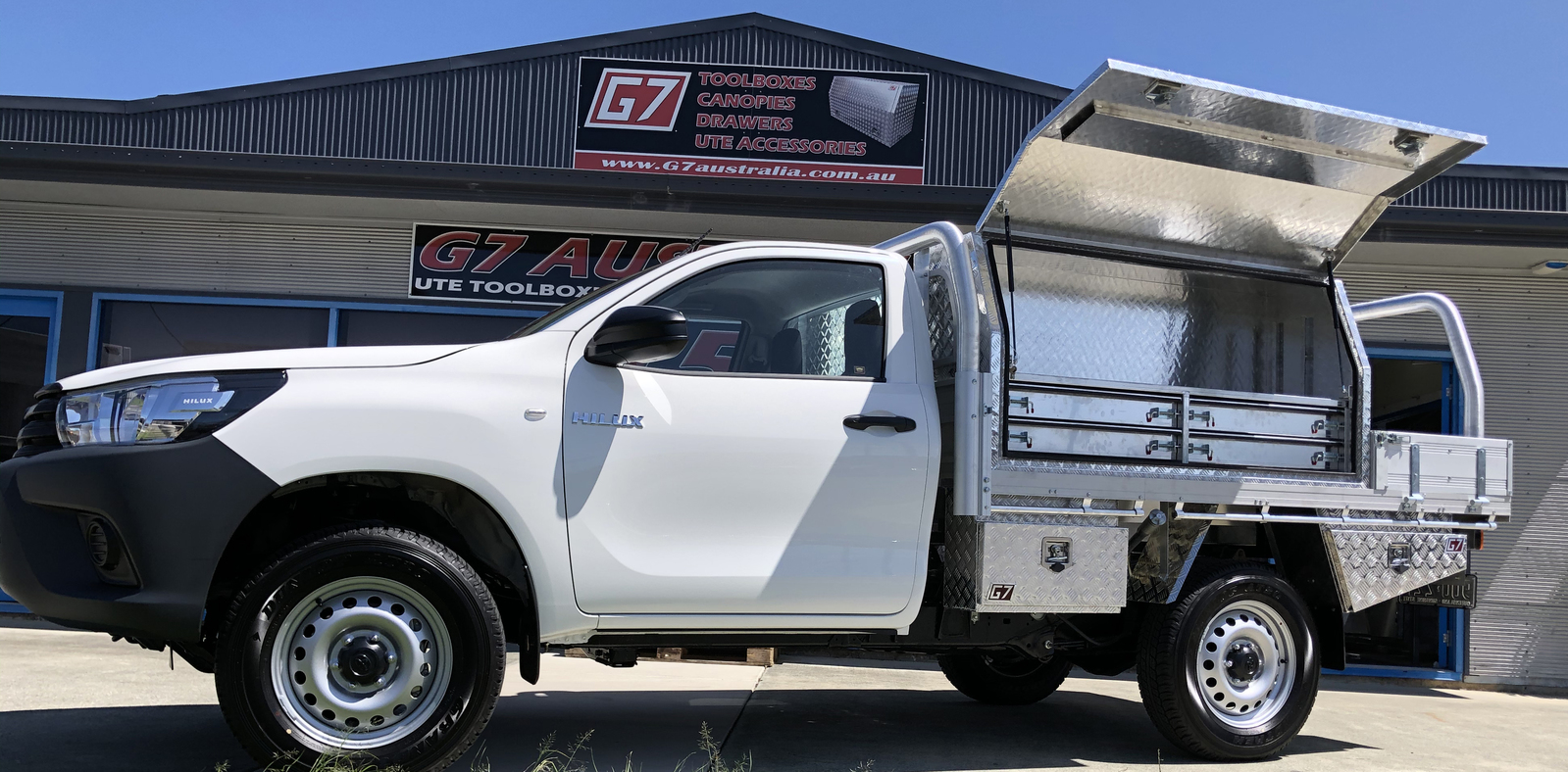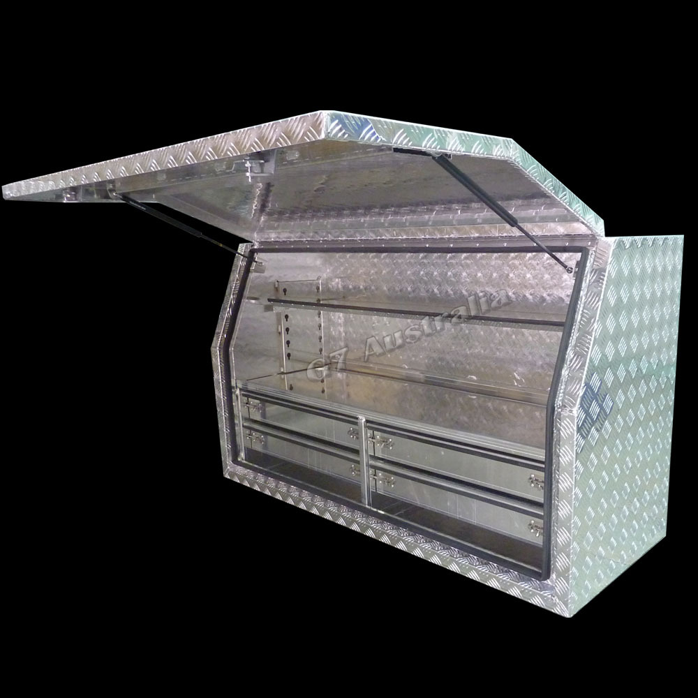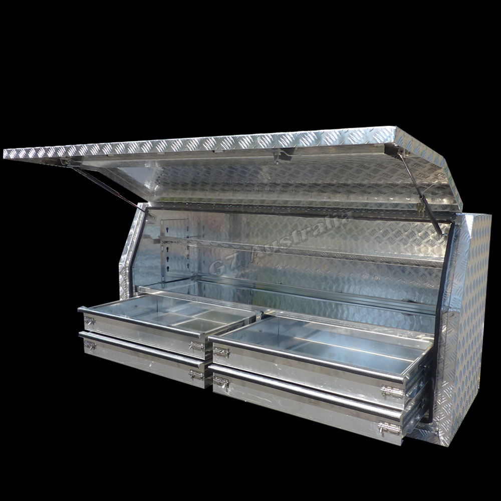 The large open space of the Aluminium Toolbox is the perfect place to store your larger tools while the four fully built-in drawers are ideal to store your smaller tools, while the adjustable height shelf is a great place to store your fittings and fixings. The four drawer Pro Box is the ultimate in Ute Tray storage. Check out our range of Accessories!